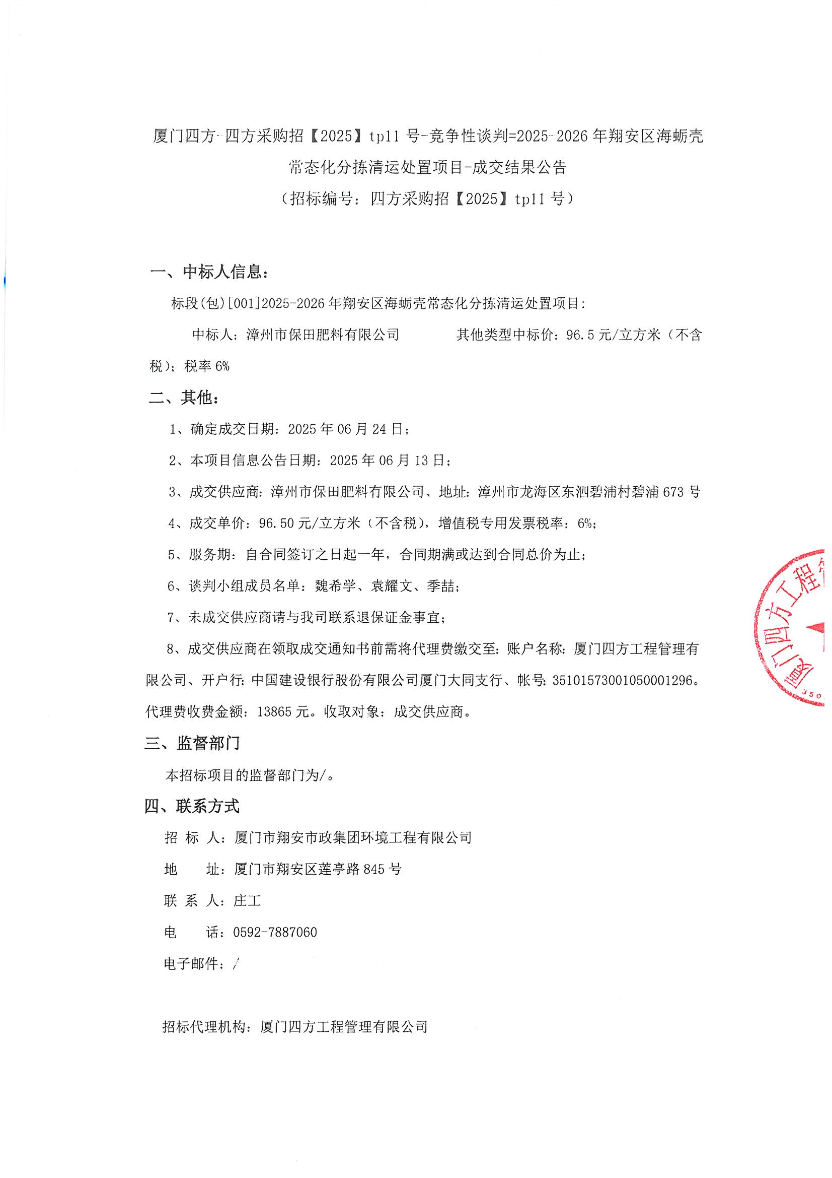厦门四方-四方采购招【2025】tp11号-竞争性谈判=2025-2026年翔安区海蛎壳常态化分拣清运处置项目-成交结果公告